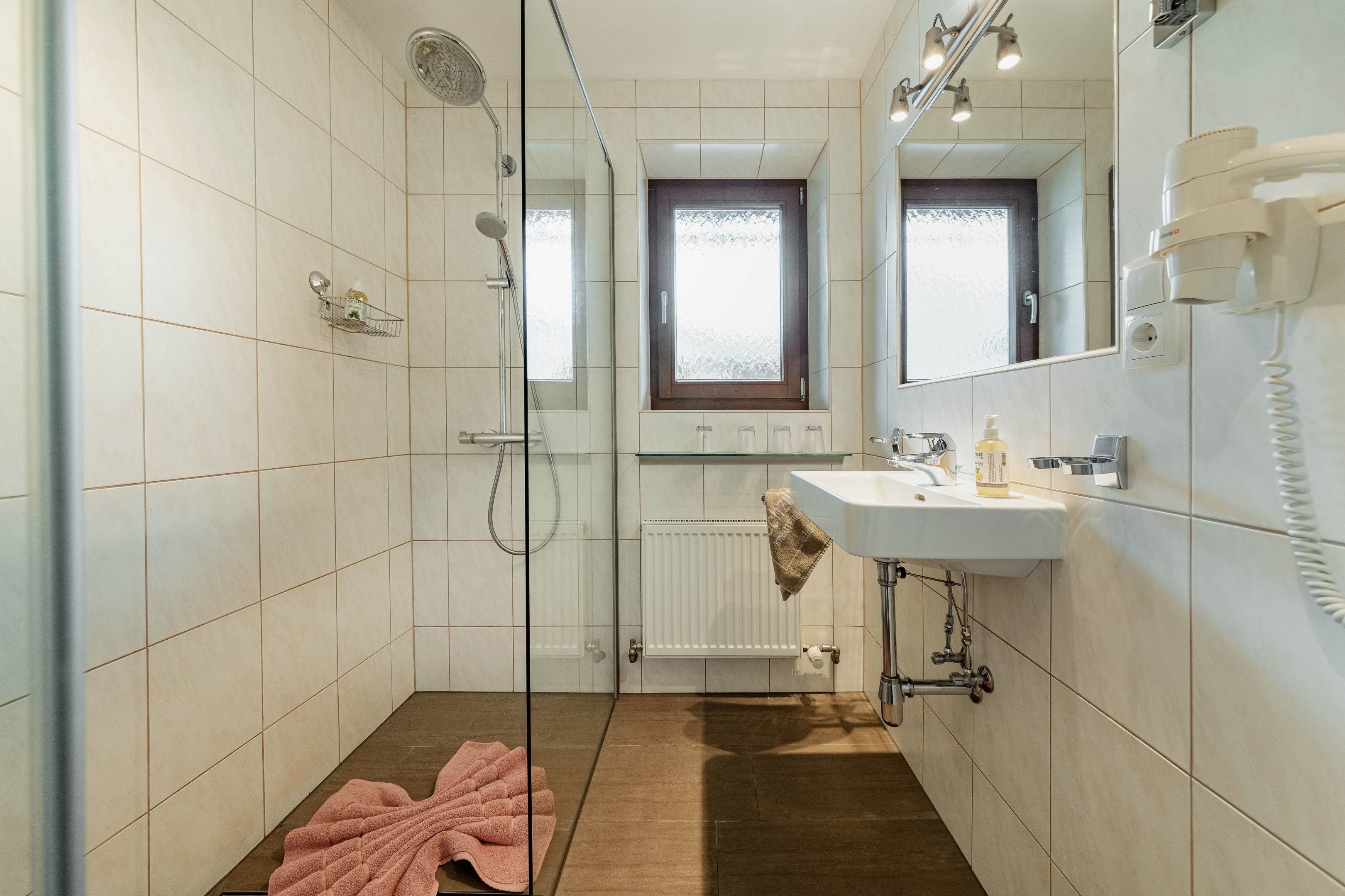 Das Badezimmer mit einer großzügigen Dusche, WC, Kosmetikspiegel und Handtüchern ausgestattet. Verwöhnen Sie sich zusätzlich mit hochwertigen METZLER Molke Pflegeprodukten und genießen Sie das Gefühl von Frische und Pflege.
